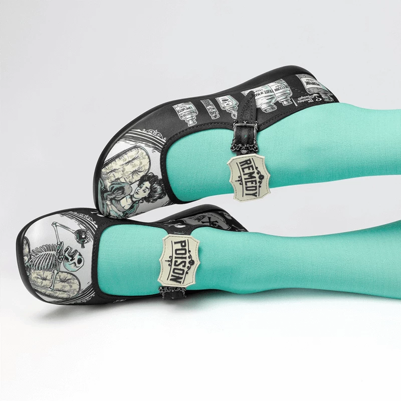 The Drugstore flats are to die for! These gorgeous flats feature a life and death inspired design on a black/grey background.
