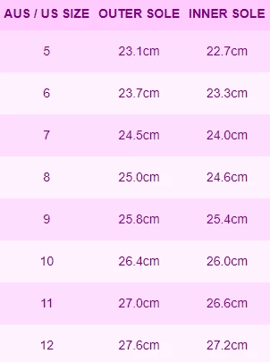 Sizing information – For a perfect size, measure your foot from heel to toe and refer to the sole measurements below. Then simply choose the size nearest your measurement.