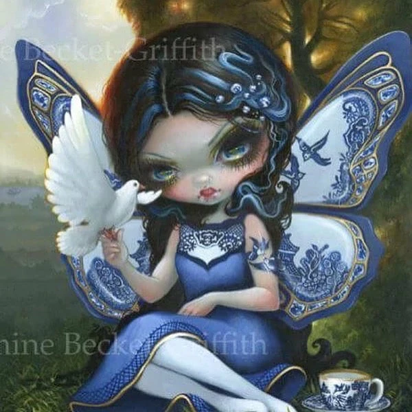 These earrings are based upon the artwork by Jasmine Becket-Griffith from the “Blue Willow” series featuring fantastical dragon-winged fairy. Look closely at her wings which are painted with the iconic blue willow porcelain pattern. This lovely piece features her with a peaceful dove companion.